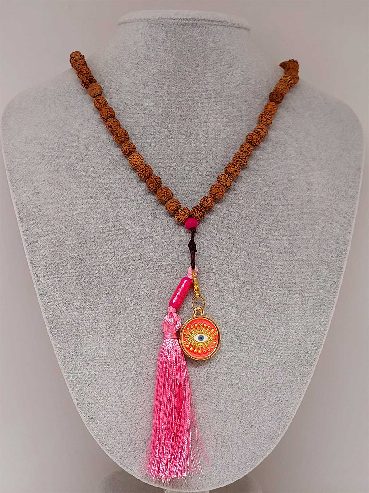 Rudraksha Tohumlu Pembe Püsküllü Göz Aparatlı 108’lik Tibet Stili El Yapımı Mala Kolye